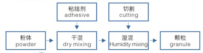 粉體物料與結合劑在混合制粒機的圓筒形容器中由底部混合槳充分混合成濕軟軟材,然后由側置的高速粉碎槳切割成均勻的濕顆粒。