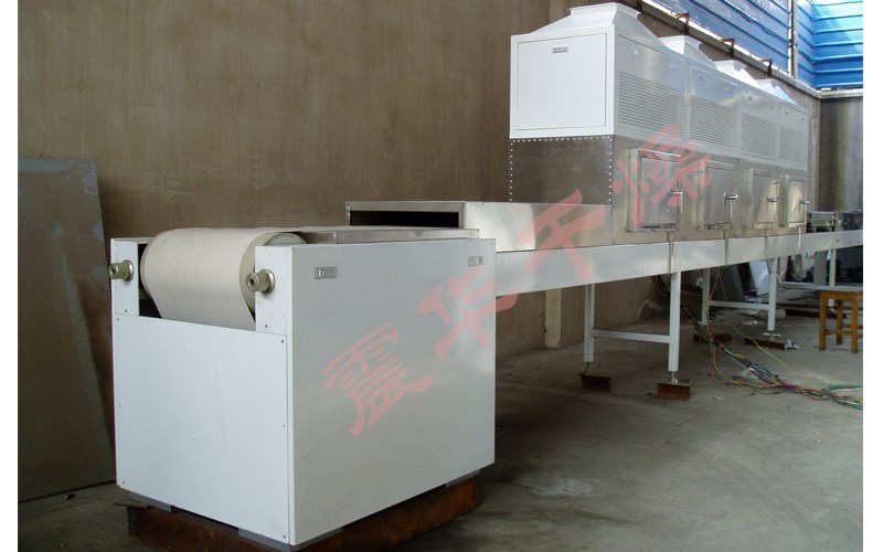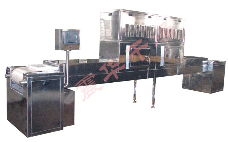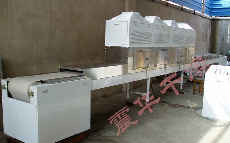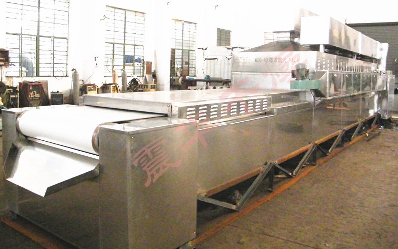 微波帶式干燥滅菌機,基本原理是物料由加料器均勻地鋪在專用履帶上,由傳動裝置拖動在機內移動。因設備上方安裝有許多微波發射裝置。當物料移動到微波發射區域內。物料中的水份就會在微波作用下,相互摩擦生熱而蒸發,而水汽不斷被抽走達到干燥作用。物料內的細菌,在微波作用下,其分子受到上億次微波頻率的高速極化,使細菌的細胞膜很快破裂而亡。起到很好的滅菌效果。